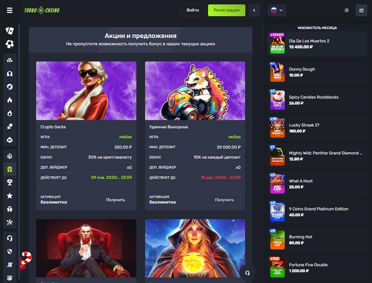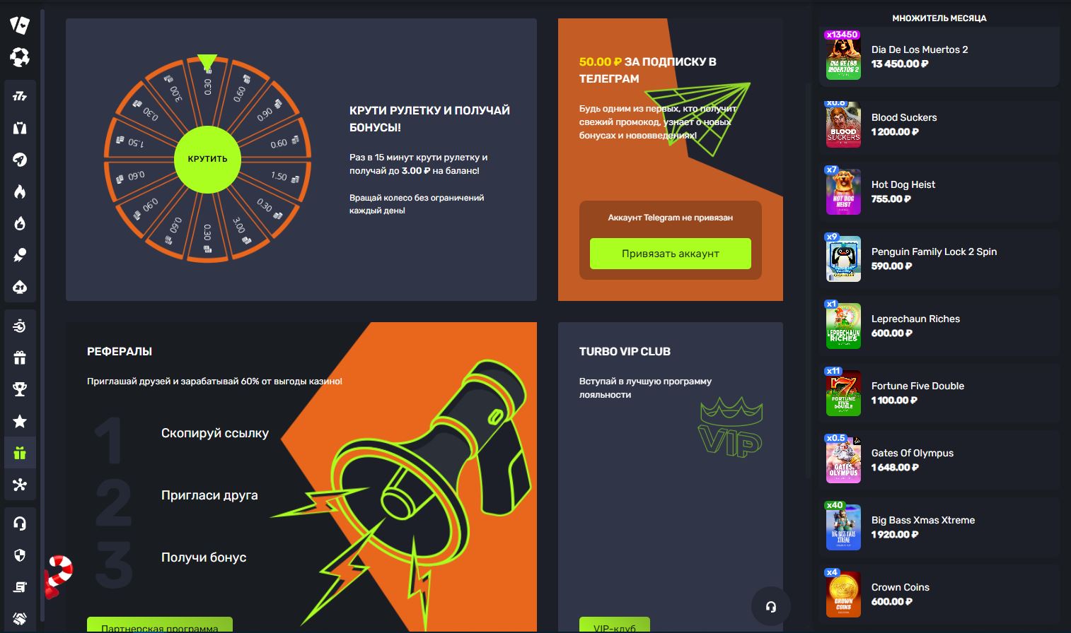 Turbo Casino предлагает игрокам различные бонусы и акции, чтобы сделать игровой процесс еще более захватывающим и выгодным. Новые игроки получают приветственный бонус при первом депозите, а также дополнительные бесплатные спины. Кроме того, Turbo Casino предлагает регулярные акции и турниры, где игроки могут выиграть дополнительные призы и бонусы.